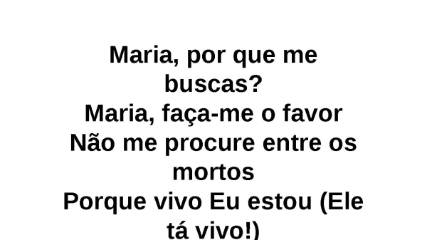 - Maria, por que me buscas?Maria, faça-me o favorNão me procure entre os mortosPorque vivo Eu estou (Ele tá vivo!)