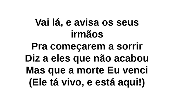- Vai lá, e avisa os seus irmãosPra começarem a sorrirDiz a eles que não acabouMas que a morte Eu venci (Ele tá vivo, e está aqui!)