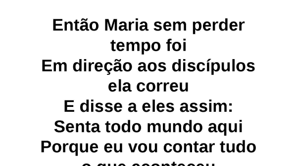 - Então Maria sem perder tempo foiEm direção aos discípulos ela correuE disse a eles assim: Senta todo mundo aquiPorque eu vou contar tudo o que aconteceu