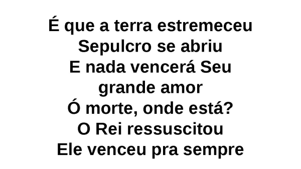 - É que a terra estremeceuSepulcro se abriuE nada vencerá Seu grande amorÓ morte, onde está?O Rei ressuscitouEle venceu pra sempre