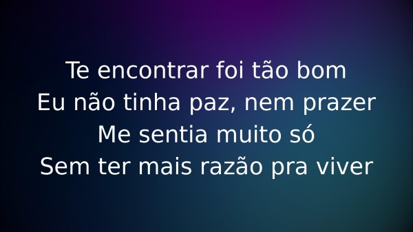 - Te encontrar foi tão bomEu não tinha paz, nem prazerMe sentia muito sóSem ter mais razão pra viver