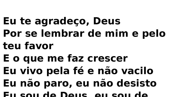 - Eu te agradeço, DeusPor se lembrar de mim e pelo teu favorE o que me faz crescerEu vivo pela fé e não vaciloEu não paro, eu não desistoEu sou de Deus, eu sou de Cristo