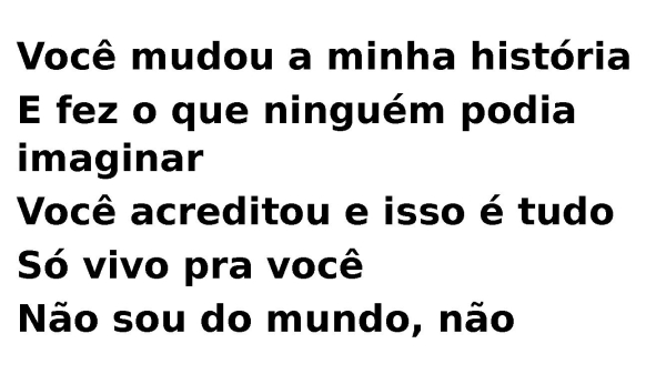 - Você mudou a minha históriaE fez o que ninguém podia imaginarVocê acreditou e isso é tudoSó vivo pra vocêNão sou do mundo, não