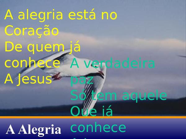 - A verdadeira paz Só tem aqueleQue já conhece A JesusA alegria está no CoraçãoDe quem já conhece A Jesus