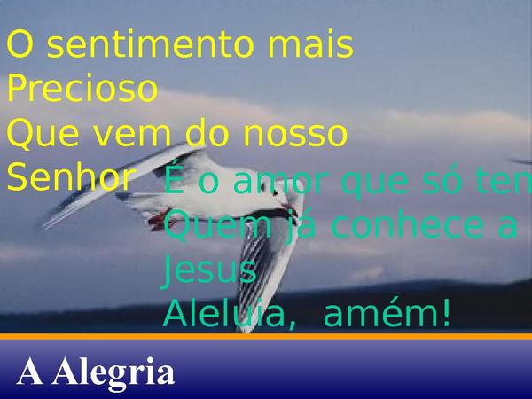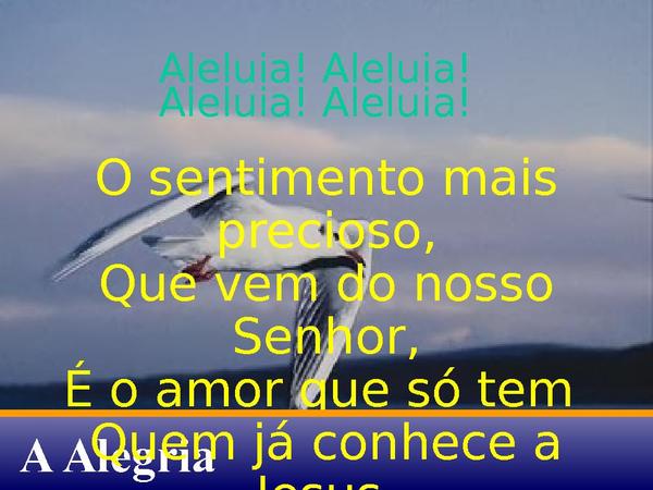 - Aleluia! Aleluia!Aleluia! Aleluia!O sentimento mais precioso,Que vem do nosso Senhor,É o amor que só tem Quem já conhece a Jesus.Aleluia, amém!