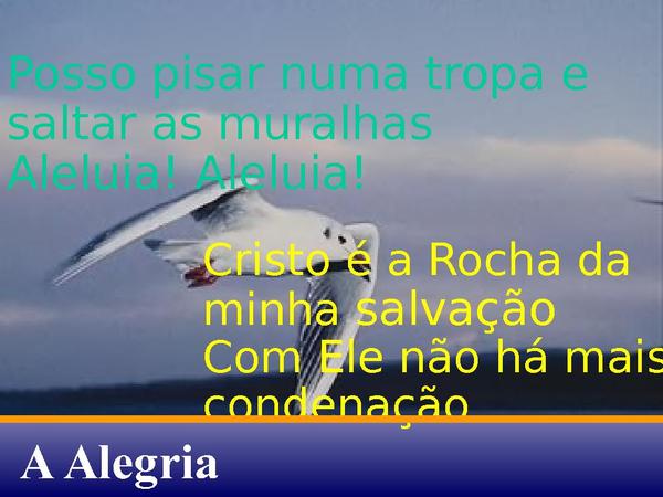 - Posso pisar numa tropa e saltar as muralhasAleluia! Aleluia! Cristo é a Rocha da minha salvaçãoCom Ele não há mais condenação