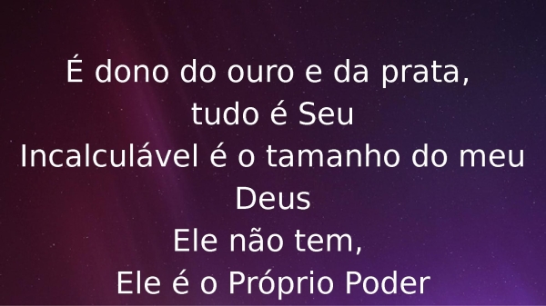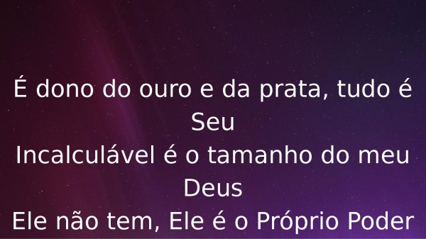 - É dono do ouro e da prata, tudo é SeuIncalculável é o tamanho do meu DeusEle não tem, Ele é o Próprio Poder