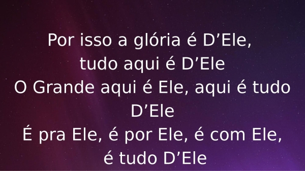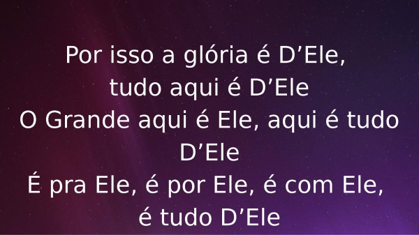 - Por isso a glória é D’Ele, tudo aqui é D’EleO Grande aqui é Ele, aqui é tudo D’EleÉ pra Ele, é por Ele, é com Ele, é tudo D’Ele