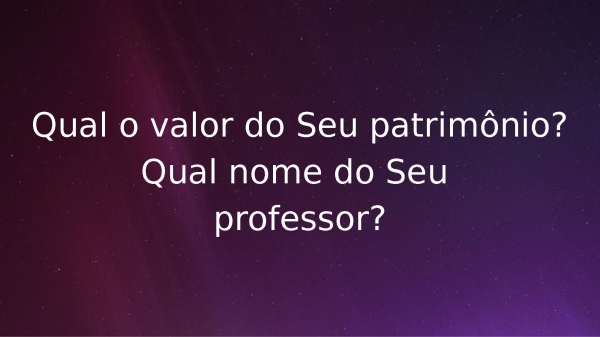 - Qual o valor do Seu patrimônio?Qual nome do Seu professor?