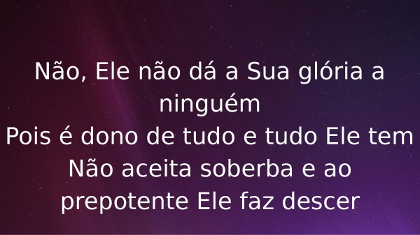 - Não, Ele não dá a Sua glória a ninguémPois é dono de tudo e tudo Ele temNão aceita soberba e ao prepotente Ele faz descer