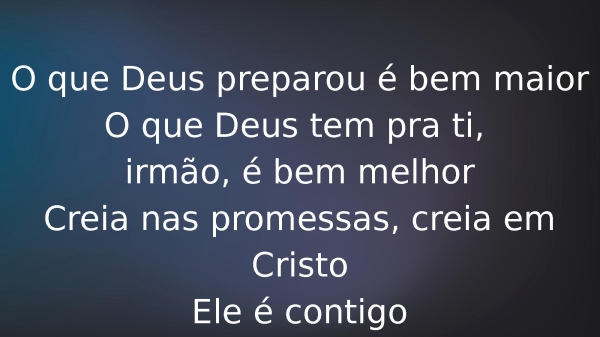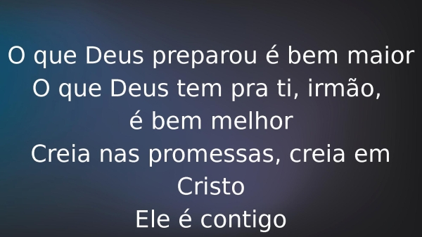 - O que Deus preparou é bem maiorO que Deus tem pra ti, irmão, é bem melhorCreia nas promessas, creia em CristoEle é contigo