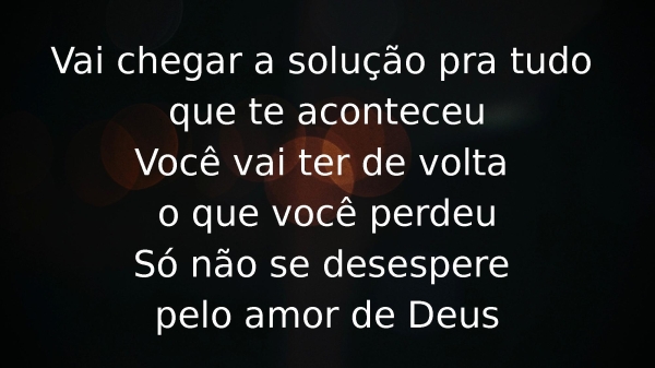 - Vai chegar a solução pra tudo que te aconteceuVocê vai ter de volta o que você perdeuSó não se desespere pelo amor de Deus