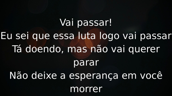 - Vai passar!Eu sei que essa luta logo vai passarTá doendo, mas não vai querer pararNão deixe a esperança em você morrerVocê precisa crer