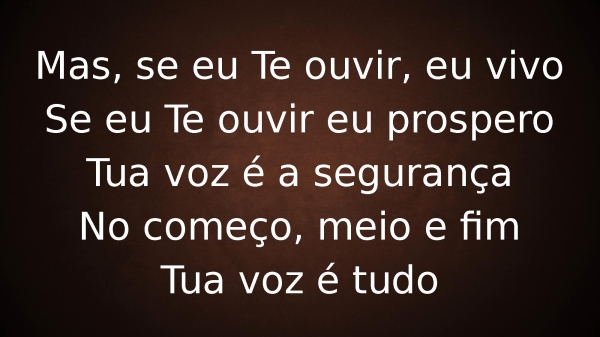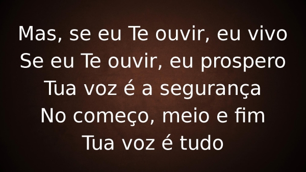 - Mas, se eu Te ouvir, eu vivoSe eu Te ouvir eu prosperoTua voz é a segurançaNo começo, meio e fimTua voz é tudo