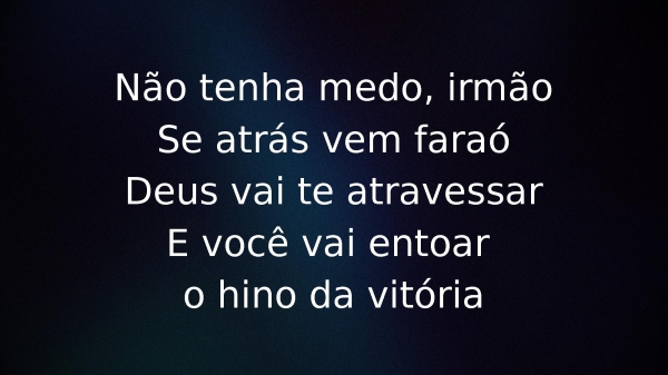 - Não tenha medo, irmãoSe atrás vem faraóDeus vai te atravessarE você vai entoar o hino da vitória