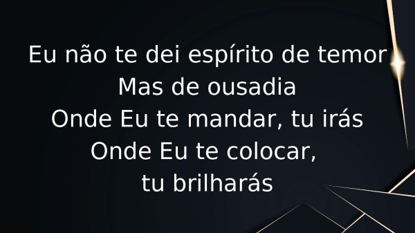 - Eu não te dei espírito de temorMas de ousadiaOnde Eu te mandar, tu irásOnde Eu te colocar, tu brilharás