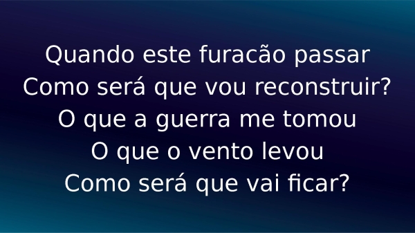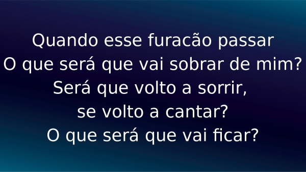 - Quando esse furacão passarO que será que vai sobrar de mim?Será que volto a sorrir, se volto a cantar?O que será que vai ficar?