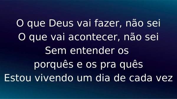 - O que Deus vai fazer, não seiO que vai acontecer, não seiSem entender os porquês e os pra quêsEstou vivendo um dia de cada vez