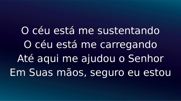 - O céu está me sustentandoO céu está me carregandoAté aqui me ajudou o SenhorEm Suas mãos, seguro eu estou