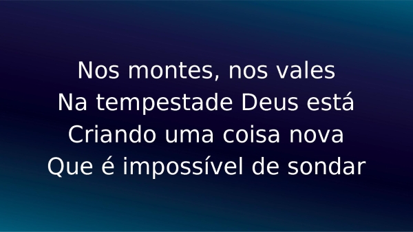 - Nos montes, nos valesNa tempestade Deus estáCriando uma coisa novaQue é impossível de sondar