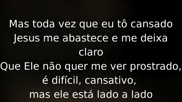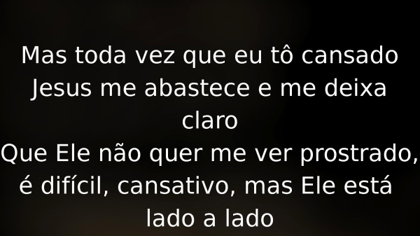 - Mas toda vez que eu tô cansado Jesus me abastece e me deixa claroQue Ele não quer me ver prostrado, é difícil, cansativo, mas ele está lado a lado
