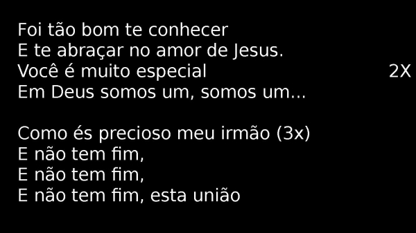 - Foi tão bom te conhecerE te abraçar no amor de Jesus.Você é muito especial 2XEm Deus somos um, somos um...Como és precioso meu irmão (3x)E não tem fim,E não tem fim,E não tem fim, esta união