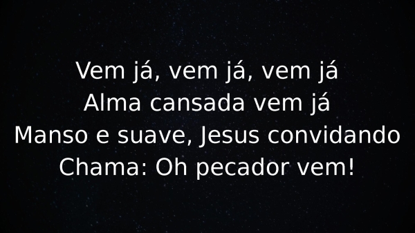 - Vem já, vem já, vem jáAlma cansada vem jáManso e suave, Jesus convidandoChama: Oh pecador vem!