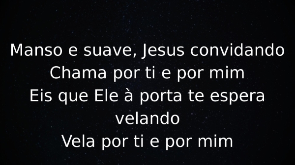 - Manso e suave, Jesus convidandoChama por ti e por mimEis que Ele à porta te espera velandoVela por ti e por mim