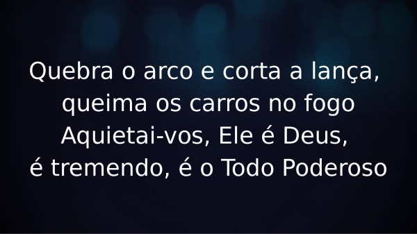 - Quebra o arco e corta a lança, queima os carros no fogoAquietai-vos, Ele é Deus, é tremendo, é o Todo Poderoso