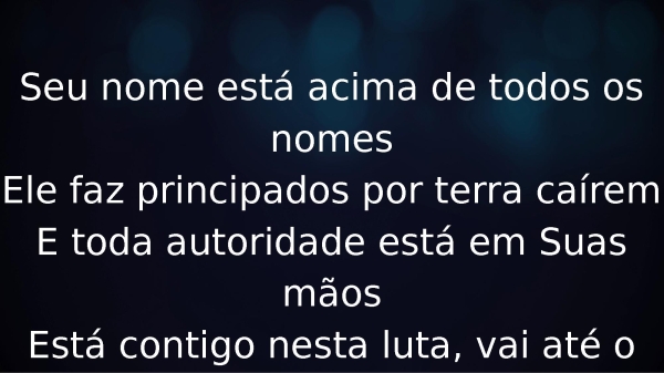 - Seu nome está acima de todos os nomesEle faz principados por terra caíremE toda autoridade está em Suas mãosEstá contigo nesta luta, vai até o fimVai contigo até o fim