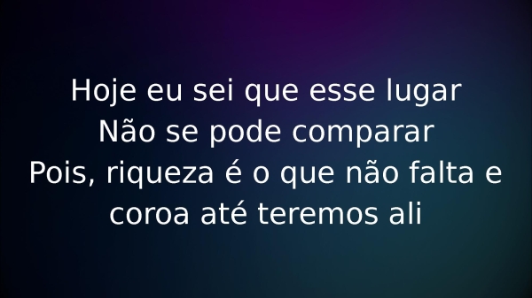 - Hoje eu sei que esse lugarNão se pode compararPois, riqueza é o que não falta e coroa até teremos ali