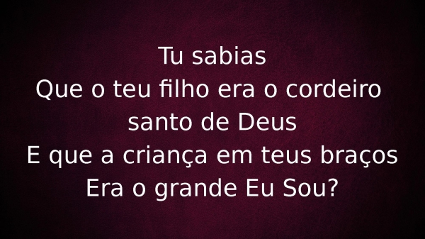 - Tu sabiasQue o teu filho era o cordeiro santo de DeusE que a criança em teus braçosEra o grande Eu Sou?