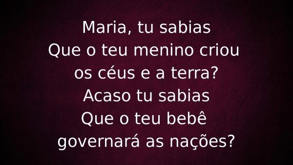 - Maria, tu sabiasQue o teu menino criou os céus e a terra?Acaso tu sabiasQue o teu bebê governará as nações?