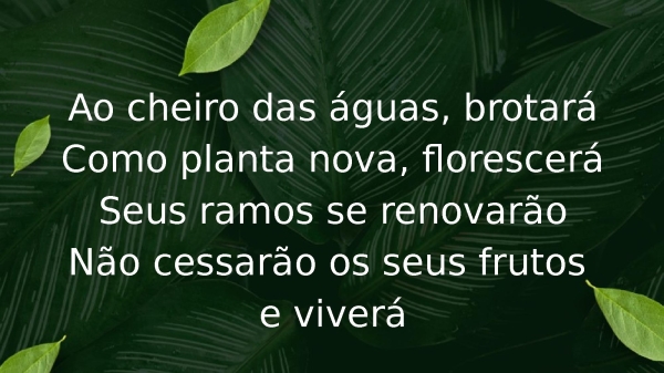 - Ao cheiro das águas, brotaráComo planta nova, floresceráSeus ramos se renovarãoNão cessarão os seus frutos e viverá