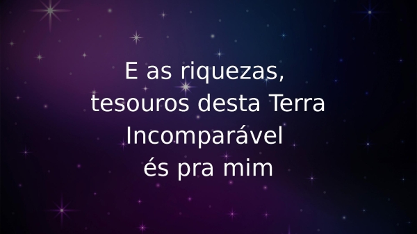 - E as riquezas, tesouros desta TerraIncomparável és pra mim