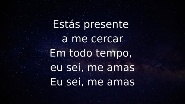 - Estás presente a me cercarEm todo tempo, eu sei, me amasEu sei, me amas