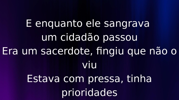 - E enquanto ele sangrava um cidadão passouEra um sacerdote, fingiu que não o viuEstava com pressa, tinha prioridadesMas faltava amor, essa é a verdade