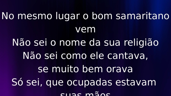 - No mesmo lugar o bom samaritano vemNão sei o nome da sua religiãoNão sei como ele cantava,se muito bem oravaSó sei, que ocupadas estavam suas mãos