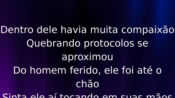 - Dentro dele havia muita compaixãoQuebrando protocolos se aproximouDo homem ferido, ele foi até o chãoSinta ele aí tocando em suas mãos