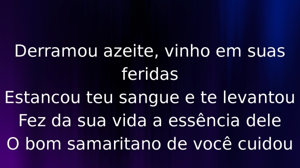 - Derramou azeite, vinho em suas feridasEstancou teu sangue e te levantouFez da sua vida a essência deleO bom samaritano de você cuidou
