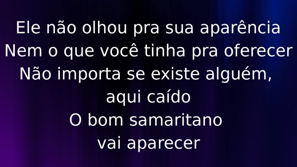 - Ele não olhou pra sua aparênciaNem o que você tinha pra oferecerNão importa se existe alguém, aqui caídoO bom samaritano vai aparecer