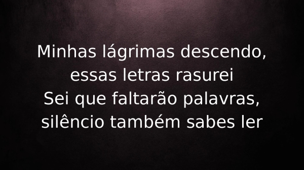 - Minhas lágrimas descendo,essas letras rasureiSei que faltarão palavras,silêncio também sabes ler