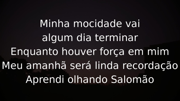 - Minha mocidade vai algum dia terminarEnquanto houver força em mimMeu amanhã será linda recordaçãoAprendi olhando Salomão