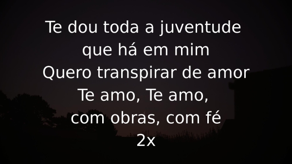 - Te dou toda a juventudeque há em mimQuero transpirar de amorTe amo, Te amo,com obras, com fé2x