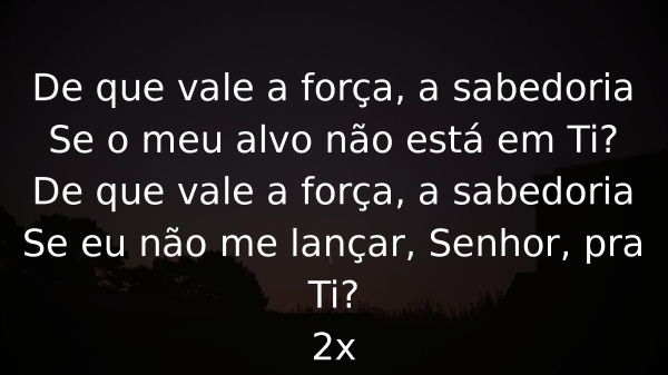 - De que vale a força, a sabedoriaSe o meu alvo não está em Ti?De que vale a força, a sabedoriaSe eu não me lançar, Senhor, pra Ti?2x