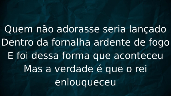 - Quem não adorasse seria lançadoDentro da fornalha ardente de fogoE foi dessa forma que aconteceuMas a verdade é que o rei enlouqueceu