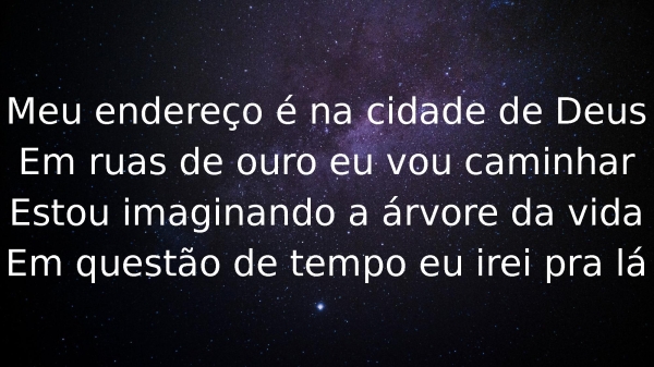 - Meu endereço é na cidade de DeusEm ruas de ouro eu vou caminharEstou imaginando a árvore da vidaEm questão de tempo eu irei pra lá