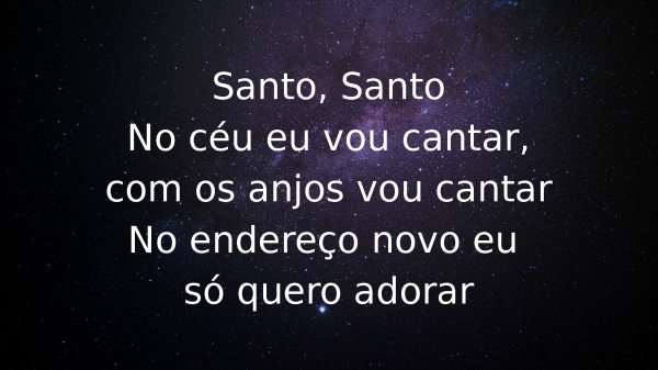 - Santo, SantoNo céu eu vou cantar,com os anjos vou cantarNo endereço novo eu só quero adorar