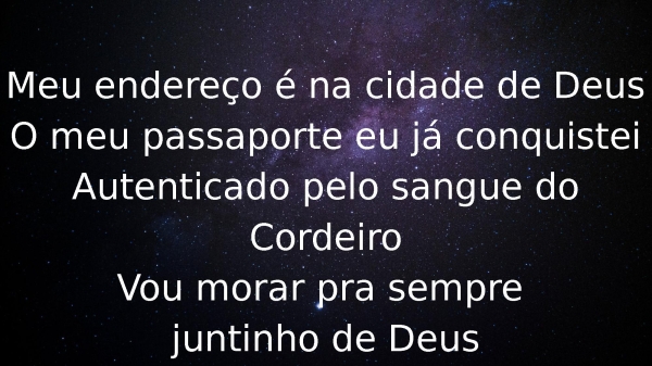 - Meu endereço é na cidade de DeusO meu passaporte eu já conquisteiAutenticado pelo sangue do CordeiroVou morar pra sempre juntinho de Deus