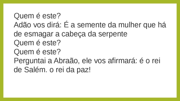 - Quem é este?Adão vos dirá: É a semente da mulher que há de esmagar a cabeça da serpenteQuem é este?Quem é este?Perguntai a Abraão, ele vos afirmará: é o rei de Salém. o rei da paz!